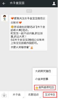1、关注“太子金宝宝”微信公众账号,点击【互动专区】进入【金妈金爸社区】;