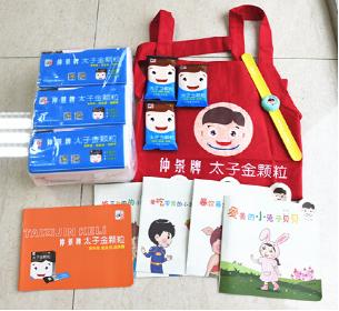 太子金健康大礼包(太子金脾胃健康手册1本、《小金故事书》4本、太子金纸抽3包,湿纸巾3包,啪啪表1个、围裙1个、太子金折页说明书)。还有太子金颗粒产品(限量20份)